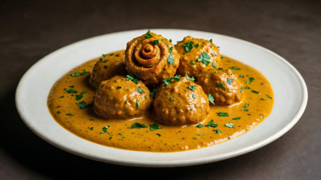 Warm gravy just before eating. Drop koftas in (or serve on top if you want them crisp). Garnish with chopped dhania and a swirl of cream.