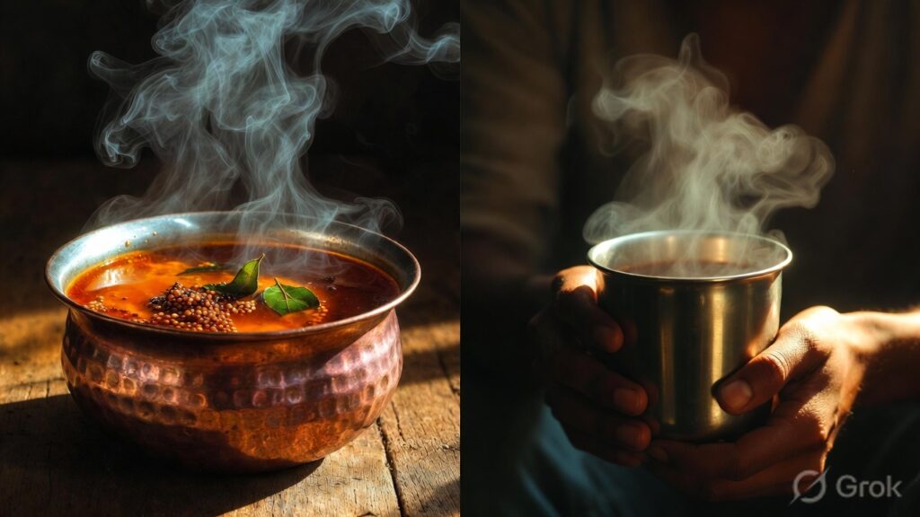 Fast forward to the British colonial days, and Rasam morphed into mulligatawny – “milagu thanni” in Tamil literally translates to “pepper water.” I read once that a 17th-century Italian traveler, Niccolao Manucci, described a similar spicy broth, praising its bold taste. In modern times, it’s a everyday comfort in South Indian households, served at family gatherings or even during festivals. In some rural spots in Tamil Nadu, folks still use it as a natural remedy for fevers or tummy troubles. It’s fascinating how something so simple has stuck around, blending old-school wisdom with what’s available from nature, like tamarind from backyard trees and spices from ancient spice trades. Every time I make it, I feel connected to that heritage.